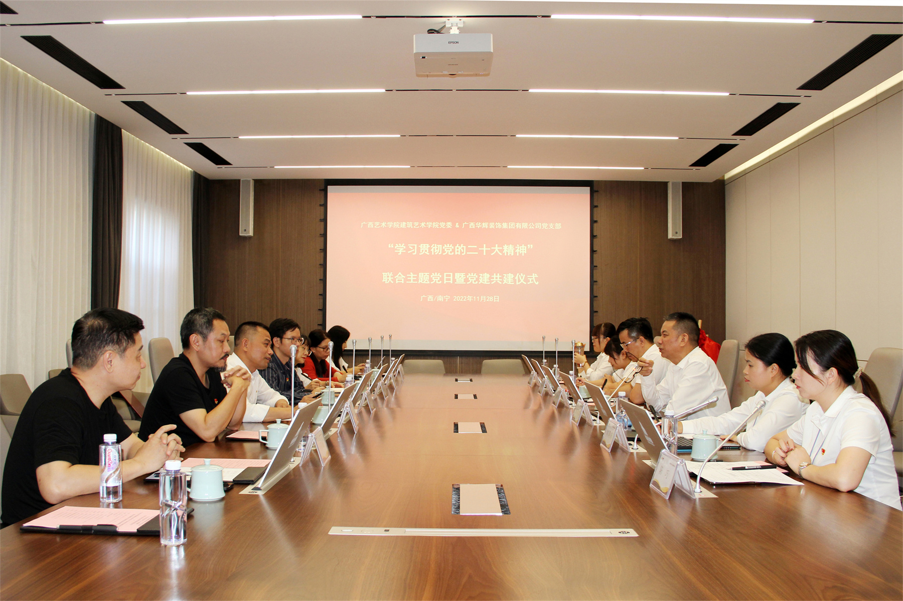2022年11月28日,广西艺术学院建筑艺术学院党委与广西vsport装饰集团有限公司党支部,开展“学习贯彻党的二十大精神”联合主题党日暨党建共建仪式;同时,广西艺术学院建筑艺术学院与广西vsport装饰集团有限公司,举行了“联合共建校外实践教育基地”揭牌仪式。