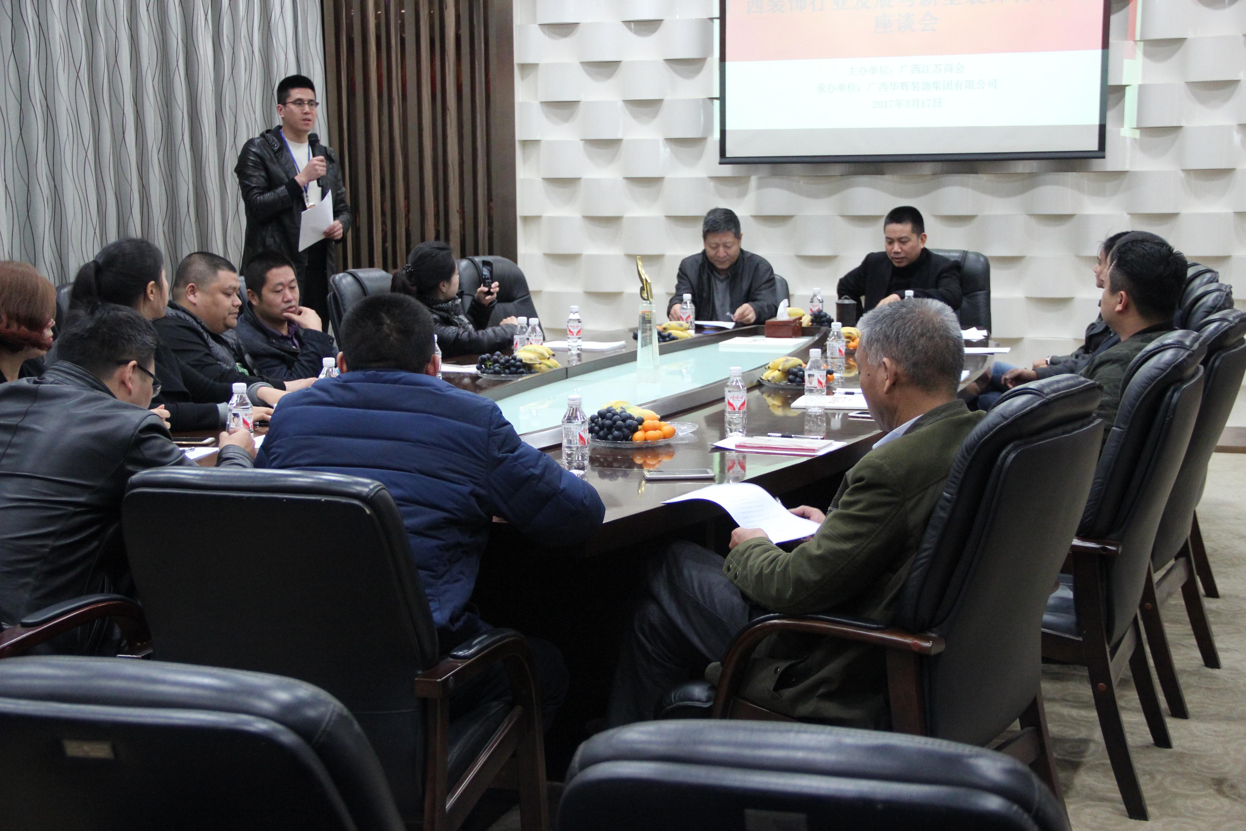 2017年3月17日下午,广西江苏商会主办的“广西装饰行业发展与新型装饰材料应用座谈会”在广西vsport装饰集团办公大楼隆重举行。座谈会由广西江苏商会秘书长朱建平主持,广西江苏商会值班会长杨景忠及二十多家商会成员等共三十多人参加了本次座谈会。大家在会上就装修装饰行业的相关问题畅所欲言,介绍了各自企业目前所掌握的资源和商机,并就目前商会的工作和管理提出中肯的建议,希望商会能够发挥更大作用,成为苏商在广西的家。
