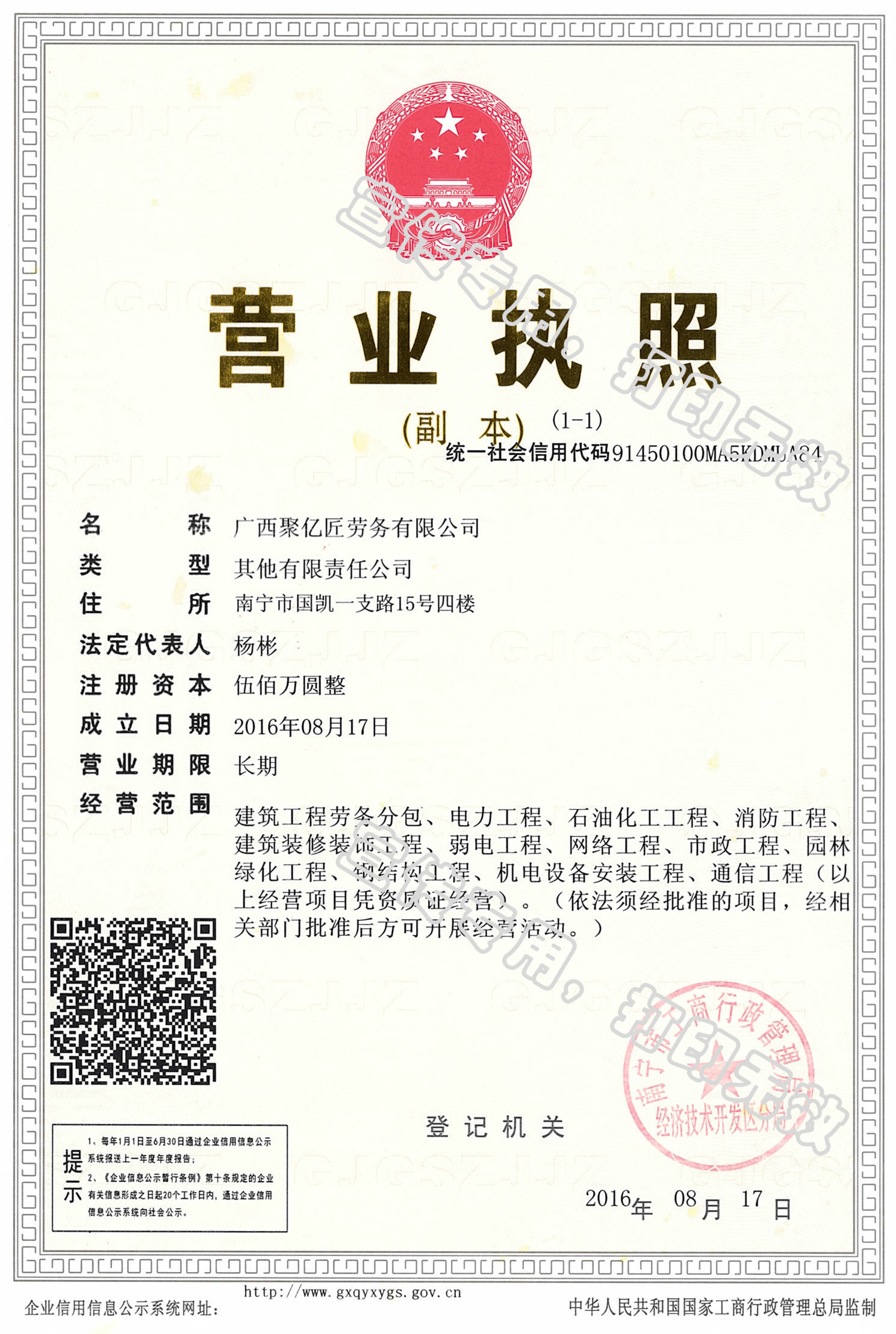 广西聚亿匠劳务有限公司成立于2016年8月17日,注册资金500万元,系vsport集团旗下主要从事建筑工程劳务分包、建筑装修装饰工程、电力工程等业务的现代企业。