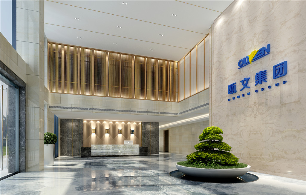 取水之蓝、家之皇为元素,以木饰面、陶瓷、大理石为载体,应用于墙面、地面、主背景墙。体现了欧文集团厚德载物,开放包容,儒雅热情迎八方来客的气魄。