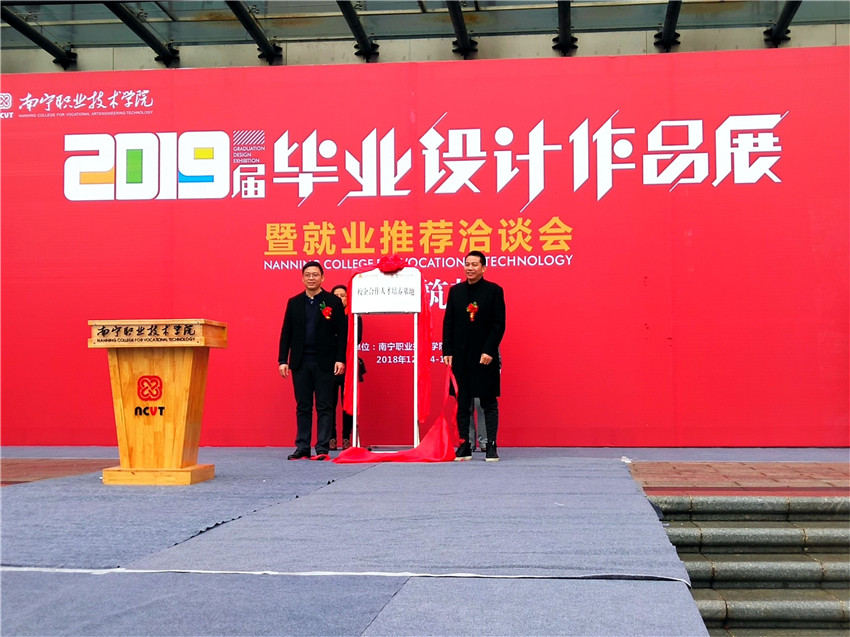 开幕式举行了南职院艺术工程学院与vsport装饰集团“校企合作人才培养基地”揭牌仪式,南宁职业技术学院艺术工程学院党委书记张治中、杨景忠董事长共同揭开了牌匾。