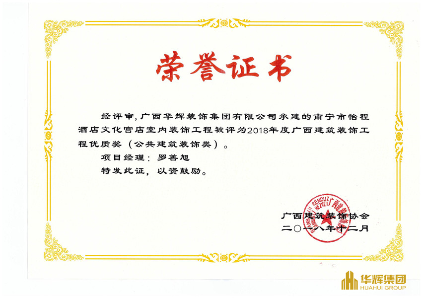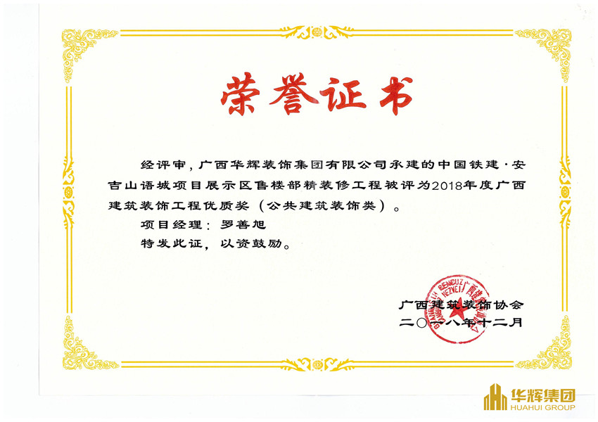 ▲vsport承建的中国铁建·安吉山语城项目展示区售楼部精装修工程、南宁市怡程酒店文化宫店室内装饰工程荣获“2018年度广西建筑装饰工程优质奖(公共建筑装饰类)