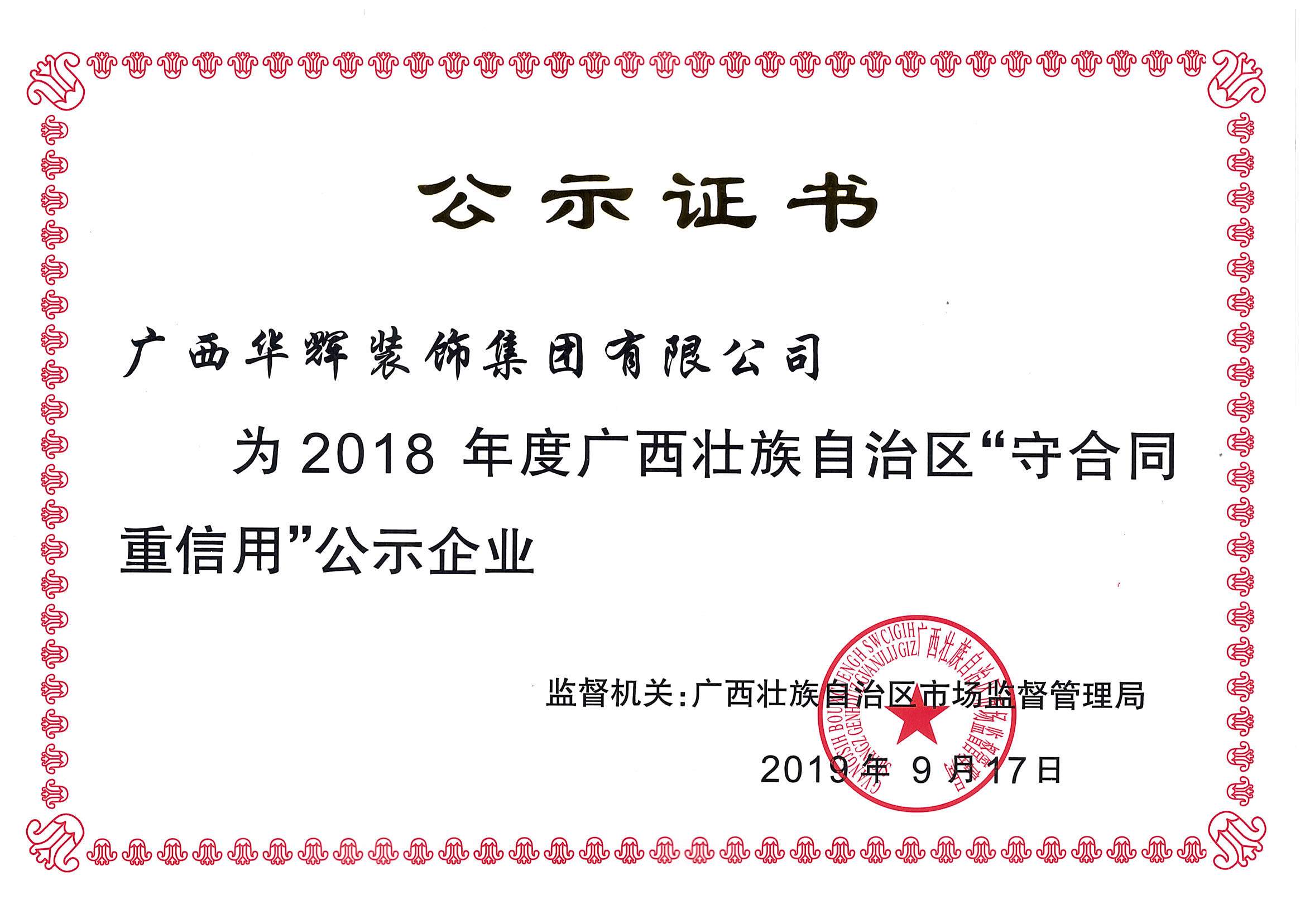 近日,在广西壮族自治区市场监督管理局开展的“守合同重信用”企业评选活动中,vsport凭借自身良好的信用体系建设、诚信守约形象,荣获2018年度广西壮族自治区“守合同重信用”企业。