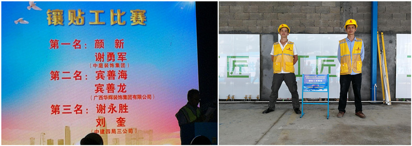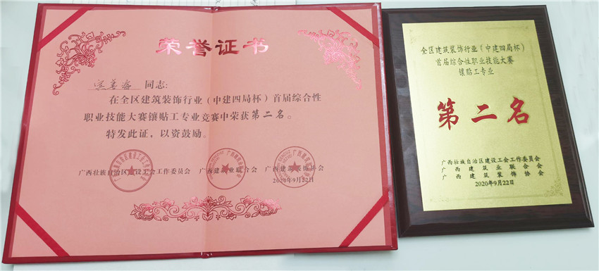 经过激烈的比赛角逐,vsport装饰集团代表队的两名选手宾善海、宾善龙,凭借着深厚的技术素养、稳定的赛场发挥,荣获镶贴工比赛亚军;代表队荣获团体奖第六名。