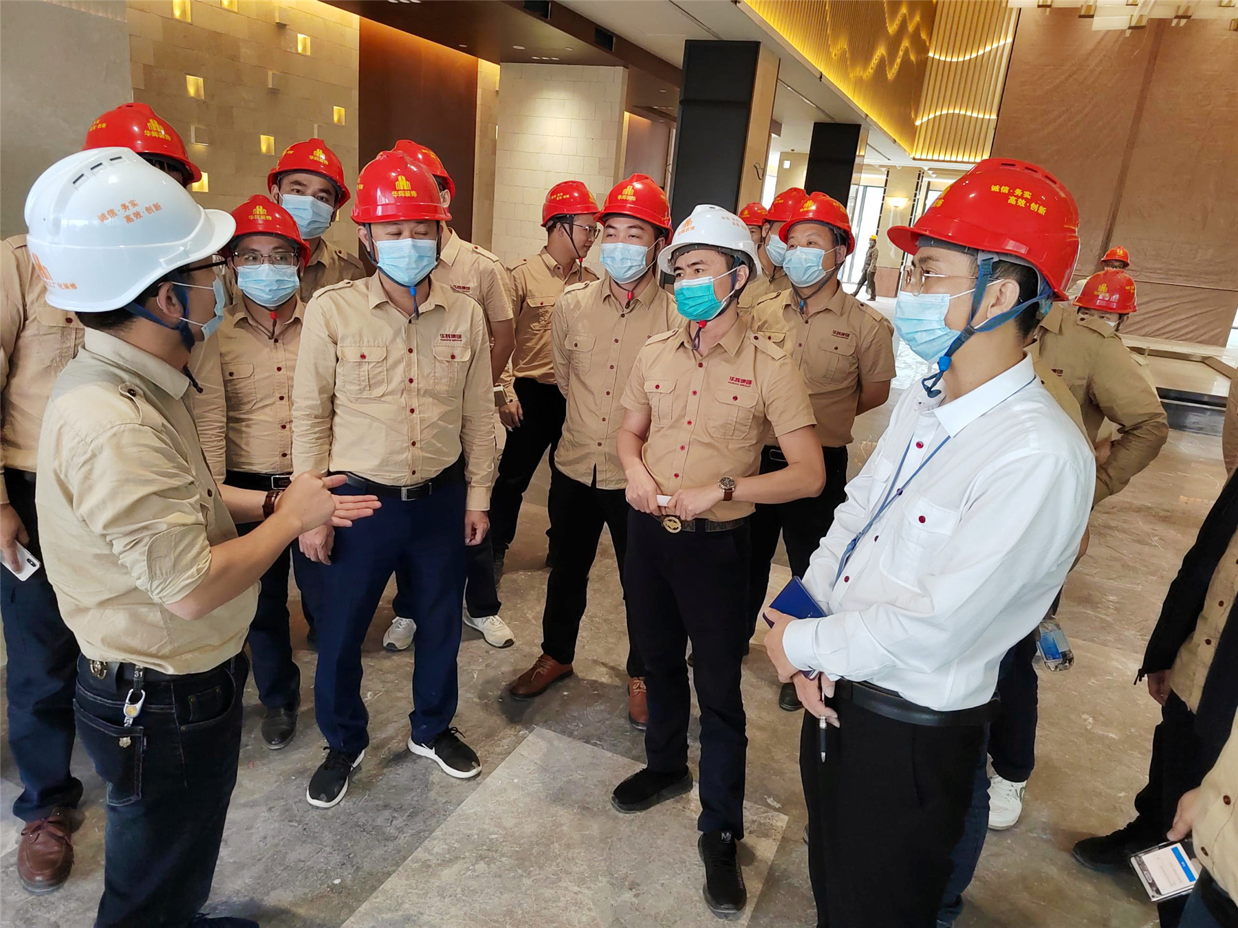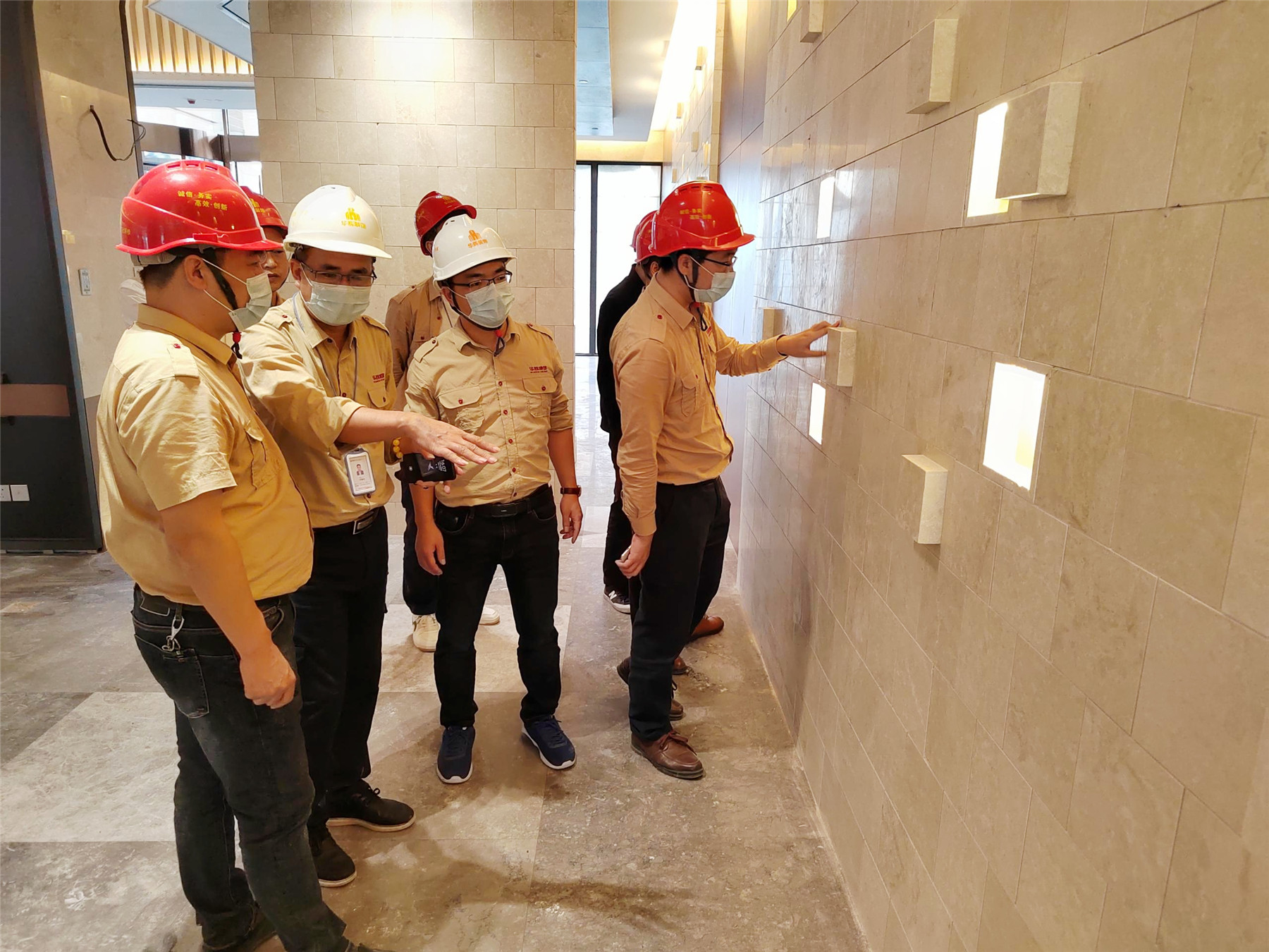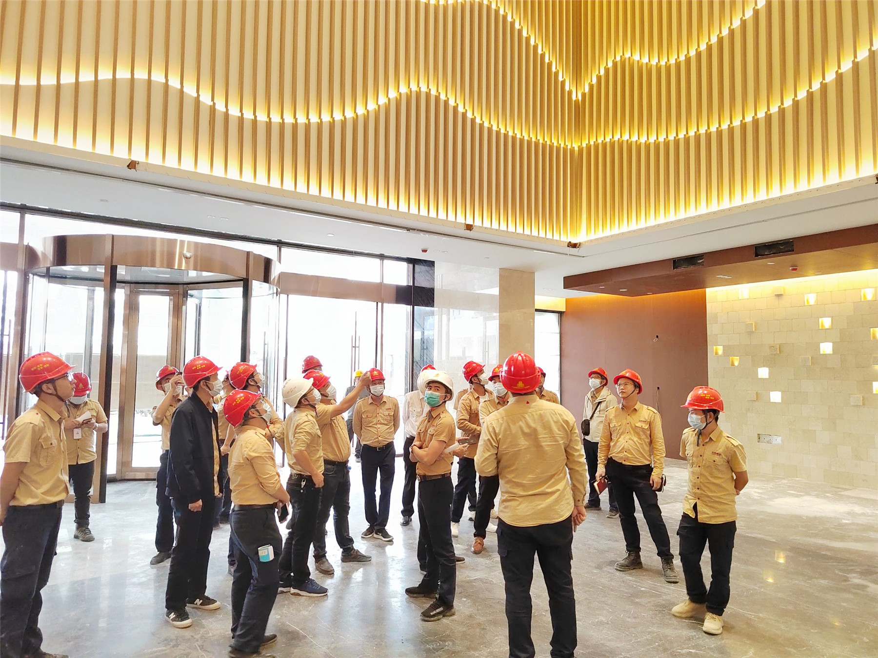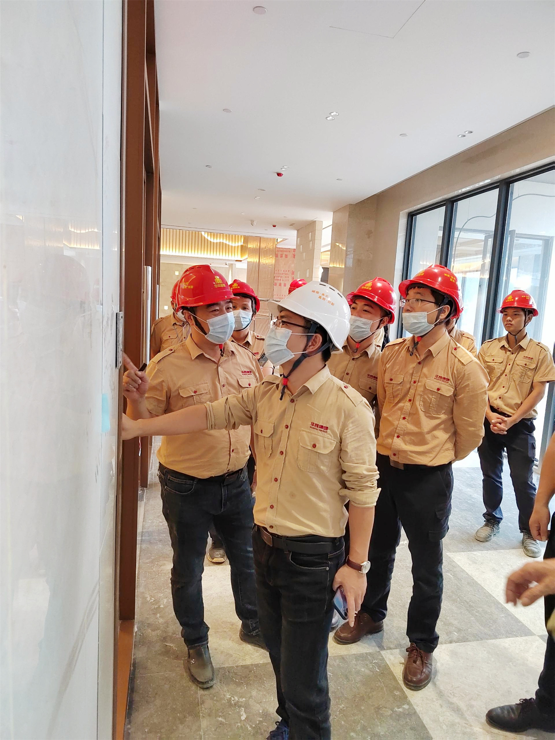 全体与会人员实地观摩陆川·温泉九龙山庄装修工程,项目部相关人员详细介绍了施工过程中的重点、难点。本次的观摩会,聚焦项目管理以及施工工艺工法。本项目从前期项目策划、材料的层层把控到施工细节的营造,无不体现vsport人对精工品质的追求。