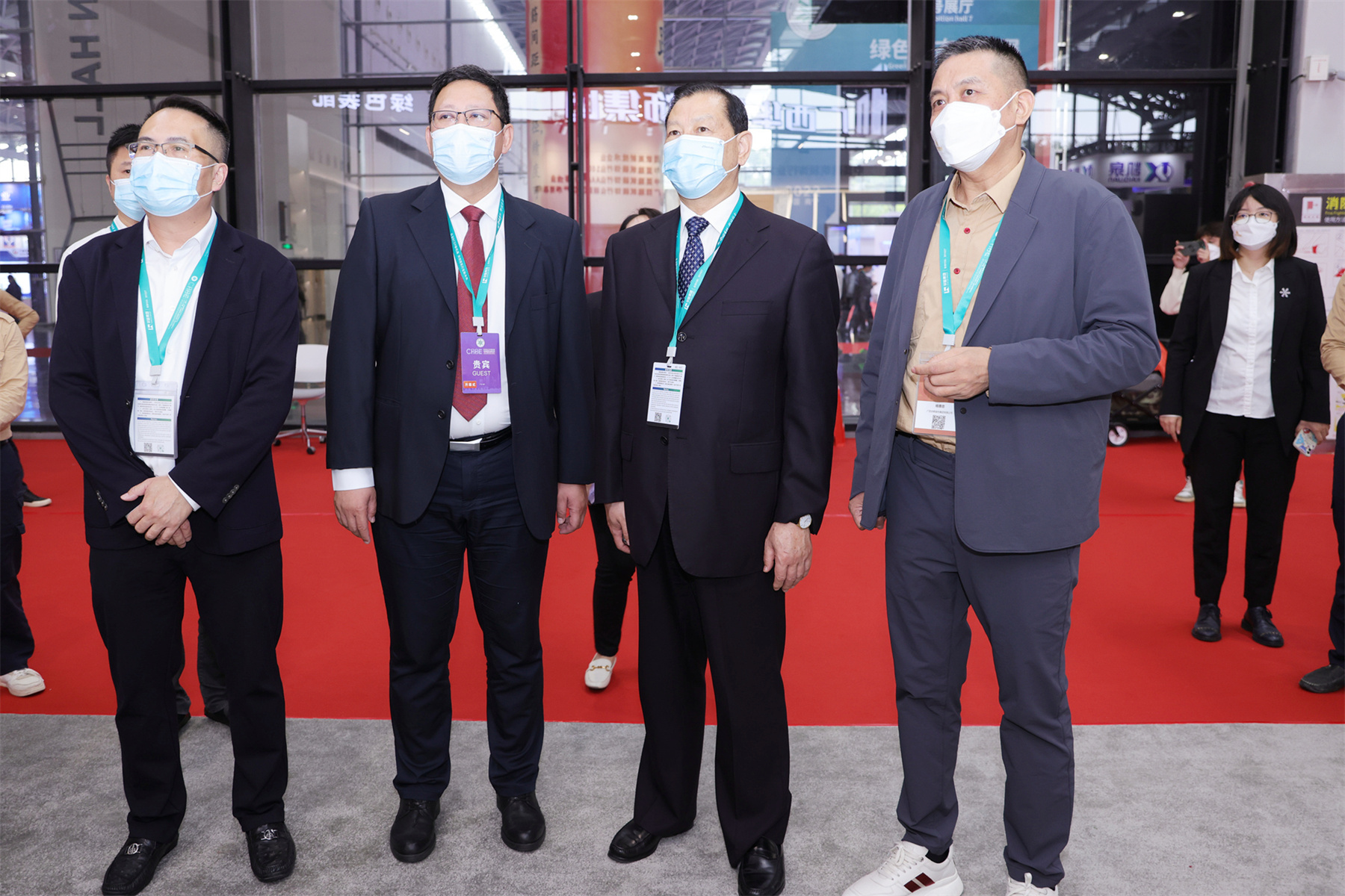 ▲中国建筑装饰协会会长王中奇(右二)、广西建筑装饰协会会长庞耀国(左一)、广西建设职业技术学院校长吴昆(左二)等领导莅临vsport展厅指导,vsport董事长杨景忠(右一)陪同