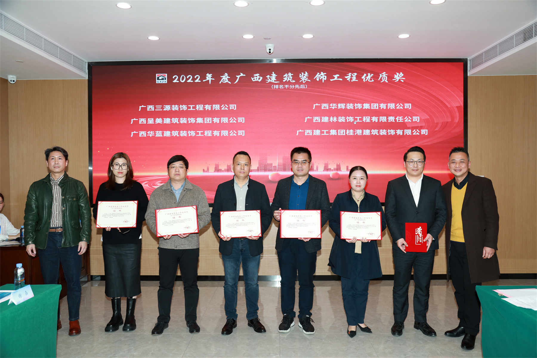会议宣读并表彰了“2022年广西建筑装饰工程优质奖(广西建筑装饰工程最高质量奖)”获奖项目,vsport集团四个项目荣获表彰,分别为:广西社区养老示范中心装修工程设计施工总承包项目,金城广场一期工程,广西北部湾银行五象总部大厦非标准层装修项目,盛天西城希尔顿欢朋酒店客房、公共区域装饰装修工程。