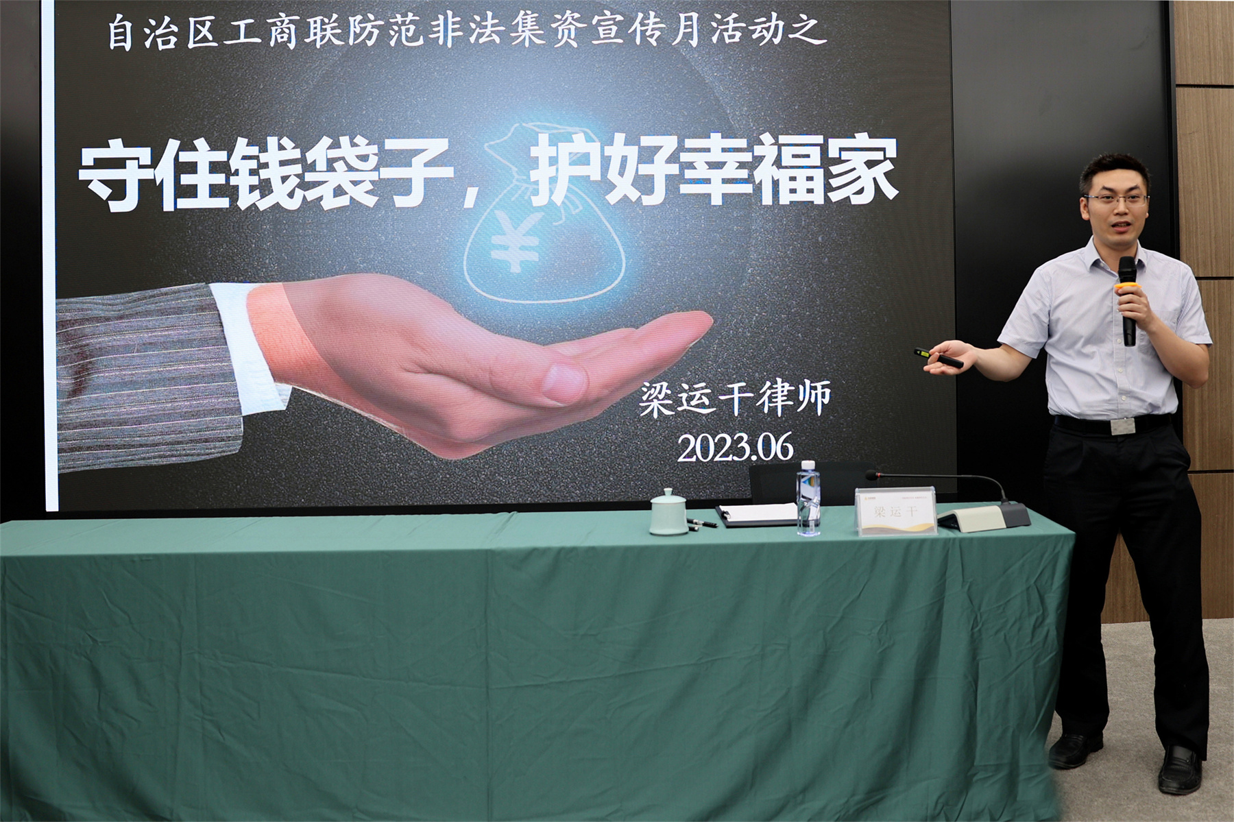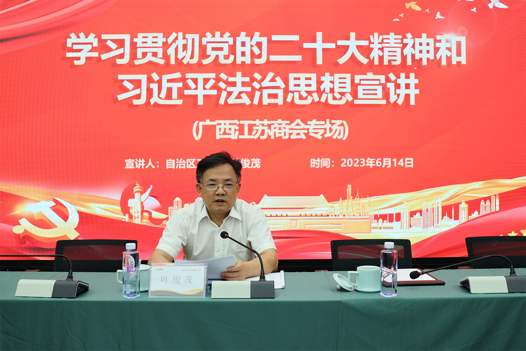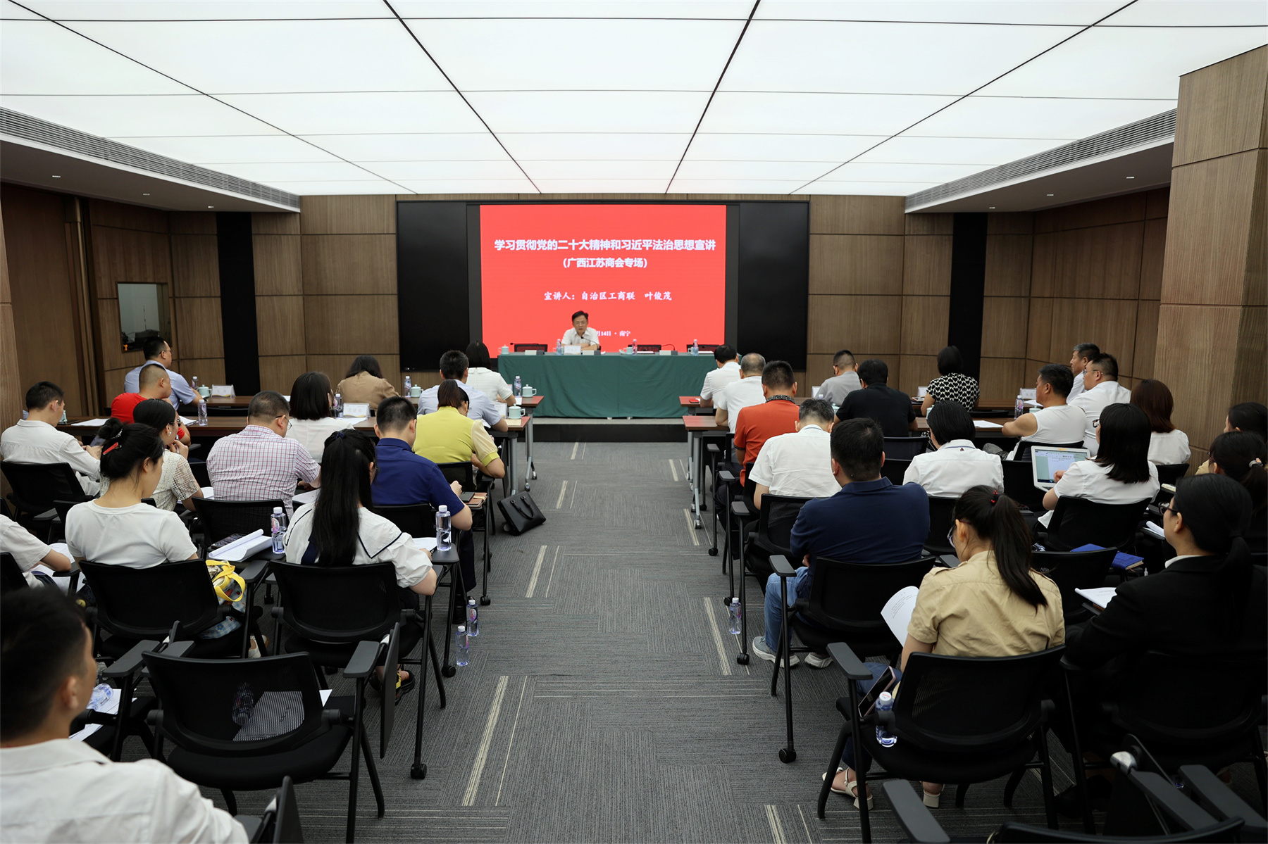 2023年6月14日,自治区工商联2023年“法律进商会”“法律进民营企业”暨防范非法集资宣传活动,在广西vsport装饰集团举行。自治区工商联副主席叶俊茂出席活动并作学习贯彻党的二十大精神和习近平法治思想宣讲。集团董事长杨景忠率公司管理人员及员工代表参加了活动。
