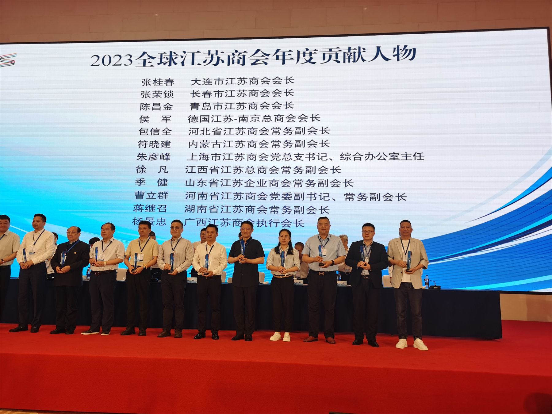 会上,广西江苏商会被江苏省工商联、全球江苏商会工作委员会授予“优秀江苏商会”称号;会议还通报表扬了一批“2023全球江苏商会年度贡献人物”,广西江苏商会执行会长杨景忠获得此殊荣并上台接受表彰。