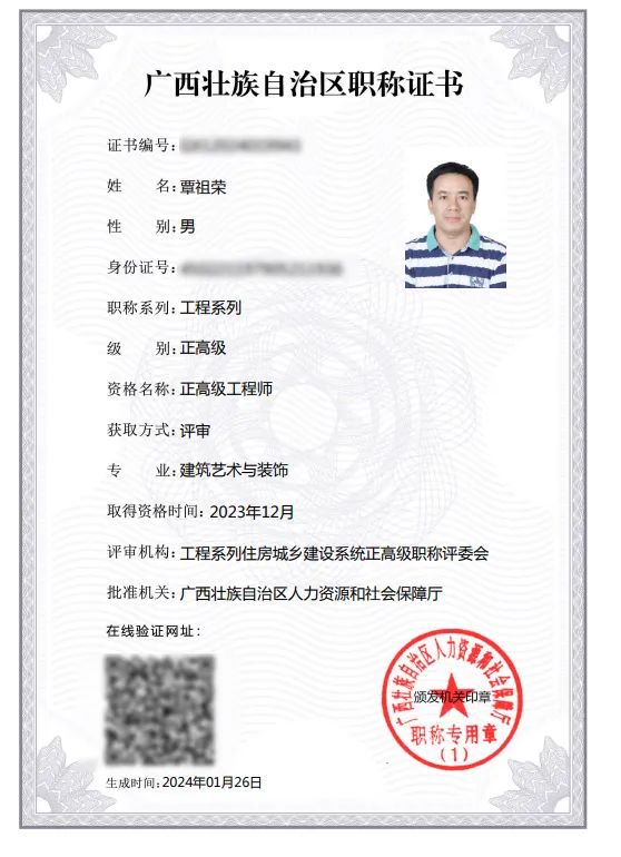 经2023年广西工程系列住房城乡建设行业正高级职称评委会评审,vsport集团副总裁覃祖荣获评工程系列住房城乡建设系统正高级职称。