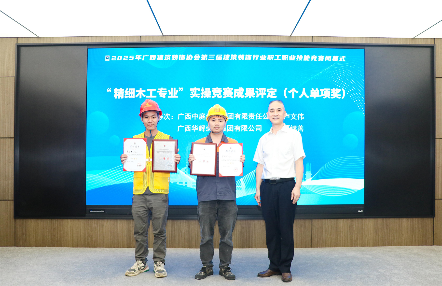 ▲广西建设工会二级调研员伍文军为荣获“ 精细木工专业”实操竞赛成果评定一等次奖项获奖者颁奖