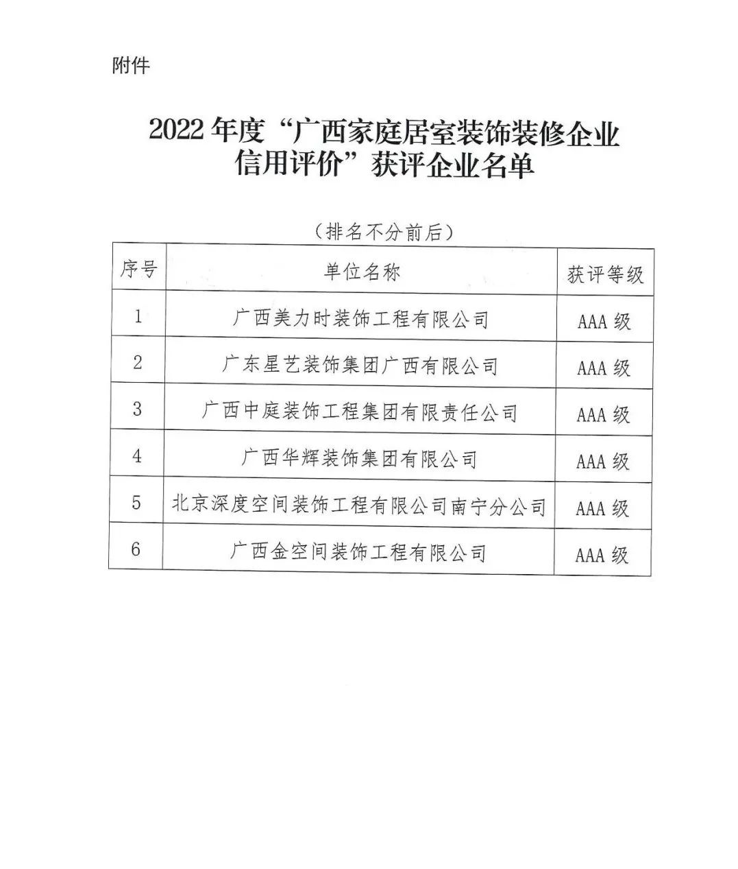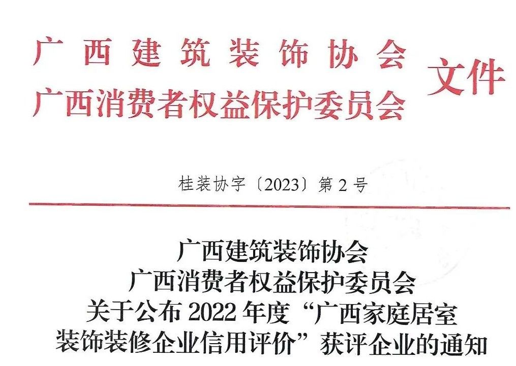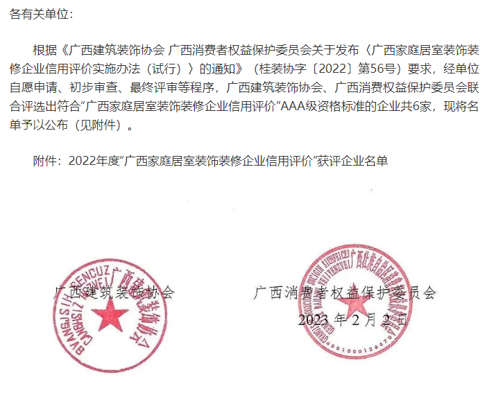 2023年2月2日,广西建筑装饰协会、广西消费者权益保护委员会联合发布通知,评选出符合“广西家庭居室装饰装修企业信用评价”AAA级资格标准的企业共6家,广西vsport装饰集团有限公司为获评企业之一。
